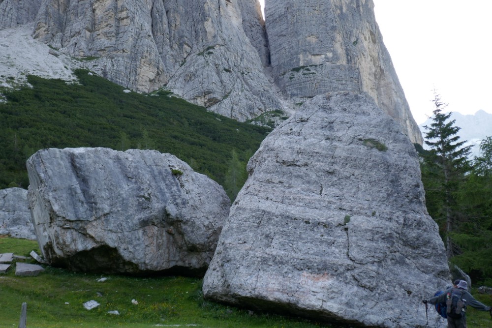 Der heutige Abschnitt besaß zwar nicht die ganze großen Höhepunkte, war aber sehr abwechslungsreich und deswegen auch interessant. Vom Rifugio Tissi stiegen wir ersteinmal gar tausend Meter runter. Dabei führte uns der Weg über grüne Wiesen und kleine Waldabschnitte.