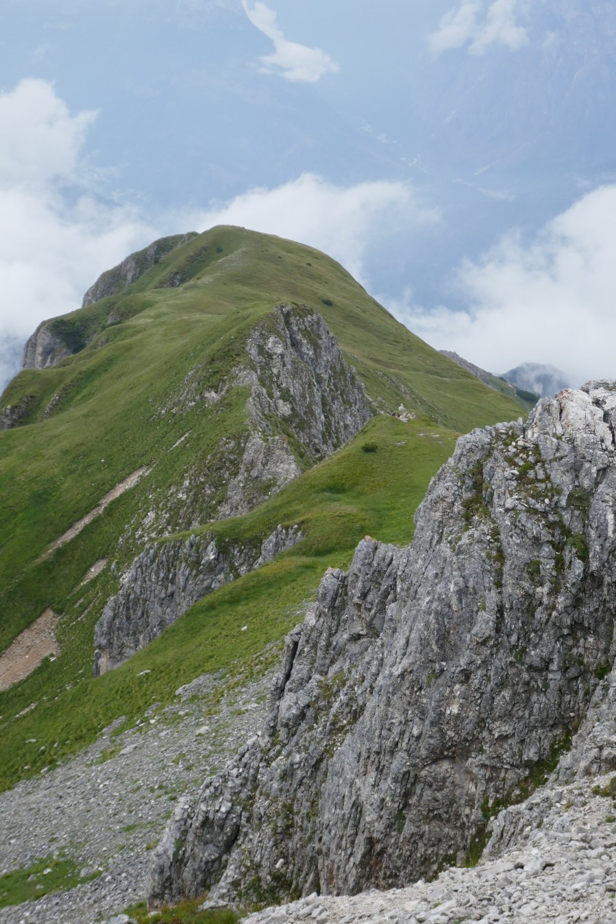 Heike und Nils dagegen sind gestern um 6 Uhr vor dem Frühstück schon aufgebrochen, damit sie möglichst früh am Klettersteig sind, da für gestern Mittag wieder Gewitter angekündigt waren und vor dem Klettersteig erst noch eine vierstündige Wanderung zu bewältigen war. Aber hier unten zumindest kann das Gewitter so spät, dass sie es noch geschafft haben müssten. Leider werden sie jetzt einen Tag hinter uns wandern, so dass wir wahrscheinlich nie erfahren werden, wie es ihnen ergangen ist.