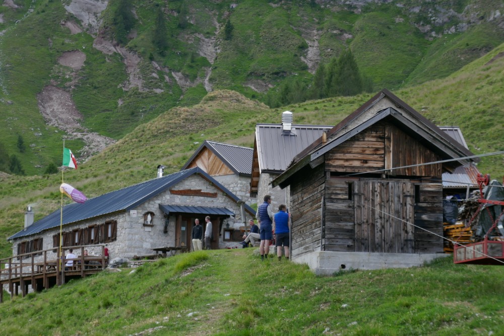Aber am Ende des sehr steilen Abstiegs sind wir wohlbehalten am Rifugio Piandefontana angenommen. Diese ehemalige Alm ist sehr urig. Das Rifugio besteht aus mehreren alten, kleinen Steinhäusern, in denen die Schlafgelegenheiten untergebracht sind und einem Haupthaus mit Gaststube und Küche. Aber es gibt WLAN, wenn auch kein sehr gutes, weswegen es heute auch keine Bilder gibt. Aber morgen im Hotel in Belluno werde ich wahrscheinlich die Bilder hinzufügen können. Morgen werden wir weitere 1400m absteigen und dann mit dem Bus nach Belluno fahren. Der eigentliche Weg ging durch die Schiara auf einem Klettersteig, aber da ich werde ein Klettersteigset mithabe noch Klettersteigerfahrung habe, habe ich diesen Teil schon von vornherein abgewählt.