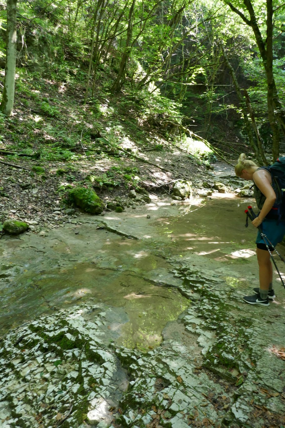 Aber bevor wir durch diese Windbruchstelle kamen, habe ich noch ein unfreiwilliges Bad in einem Bach genommen. Unser Weg führte uns nämlich über diesen Bach und auf den ersten Blick sah die Felsplatte, auf die ich meinen Fuß stellen wollte, trocken aus. Wir sich herausstellte war sie aber mit einer dünnen, Helen Schlammschicht überzogen, auf der ich ausrutschte und in den Bach fiel. Da es nur ein kleiner, niedriger Bach war und wir schon erwähnt die Temperaturen eher heiß waren, war das nicht so schlimm. Nur ist jetzt meine Hose, die ich gestern gerade gewaschen hatte, wieder total dreckig.
