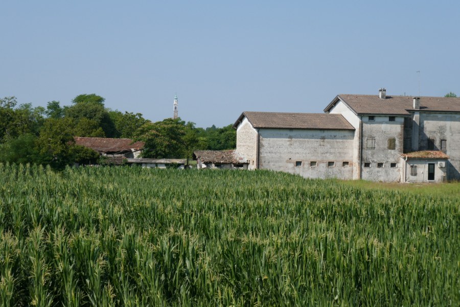 Außerdem habe ich den Eindruck, dass die Landschaft hier nicht so aufgeräumt ist, wir bei uns. Es gibt zwischen den Feldern auch immer mal wieder ungenutzte, bewachsene Flächen. Interessanterweise habe ich den Fluss Piave, an den ich heute im Prinzip den ganzen Tag entlang gewandert bin, nur am Anfang beim Überqueren der Brücke von Ponte della Priula gesehen. Sonst erst er meist hinter Gebüsch versteckt. Aber viel Wasser ist auch gerade nicht drin. Er sieht er aus, wie eine lange Kiesstraße.
