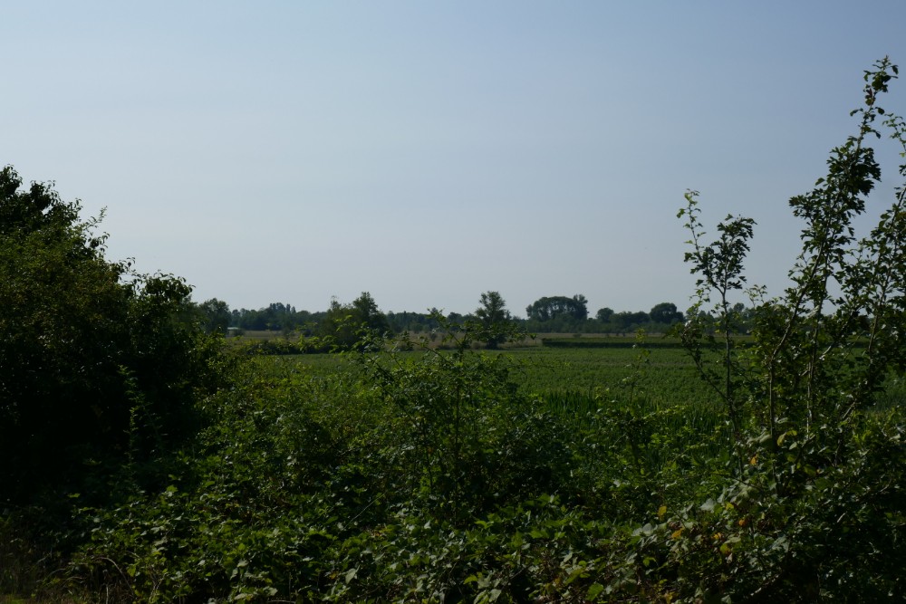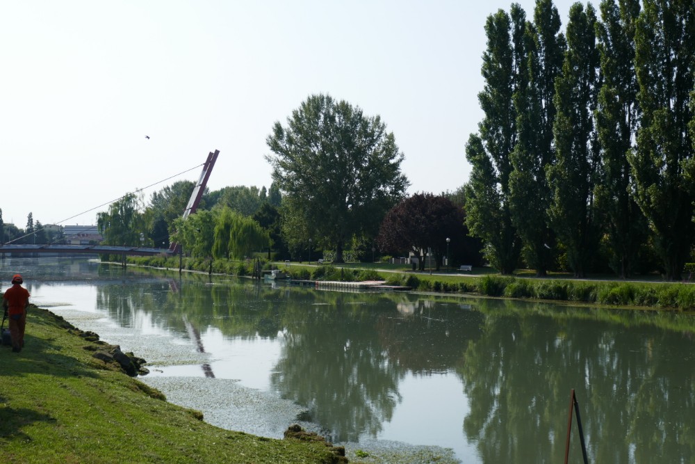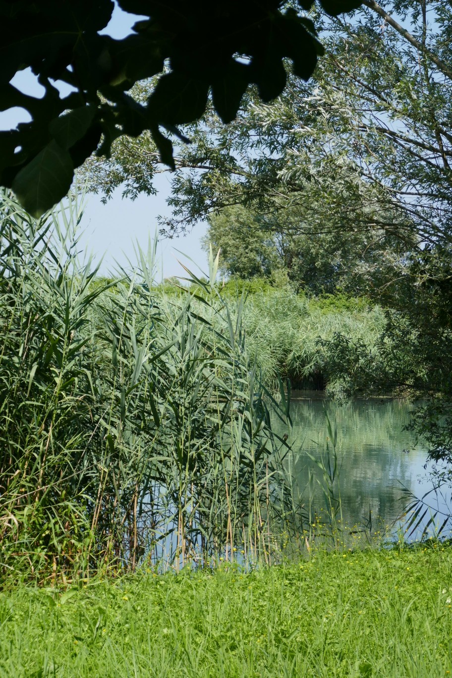 Was gibt es über den heutigen Tag außer seinen glücklichen Ende noch zu berichten? Da das Hotel erst ab 8:30 Uhr Frühstück anbot, bin ich heute erst kurz vor halb zehn gestartet, da war es schon ziemlich heiß und vor allem schwül. Und dann begann wieder so ein Geduldsspiel, über den es im Wanderführer nur lapidar heißt: Wir biegen nach rechts auf den Hochwasserdamm des Sile, den wir für 9 km folgen. D.h. 9km immer auf dem Damm entlang, mit wenig Schatten und noch weniger Abwechslung, rechts der Fluss mit schilfbestandenem Ufer, links Felder, manchmal ein paar Bäume und das fast zwei Stunden lang…