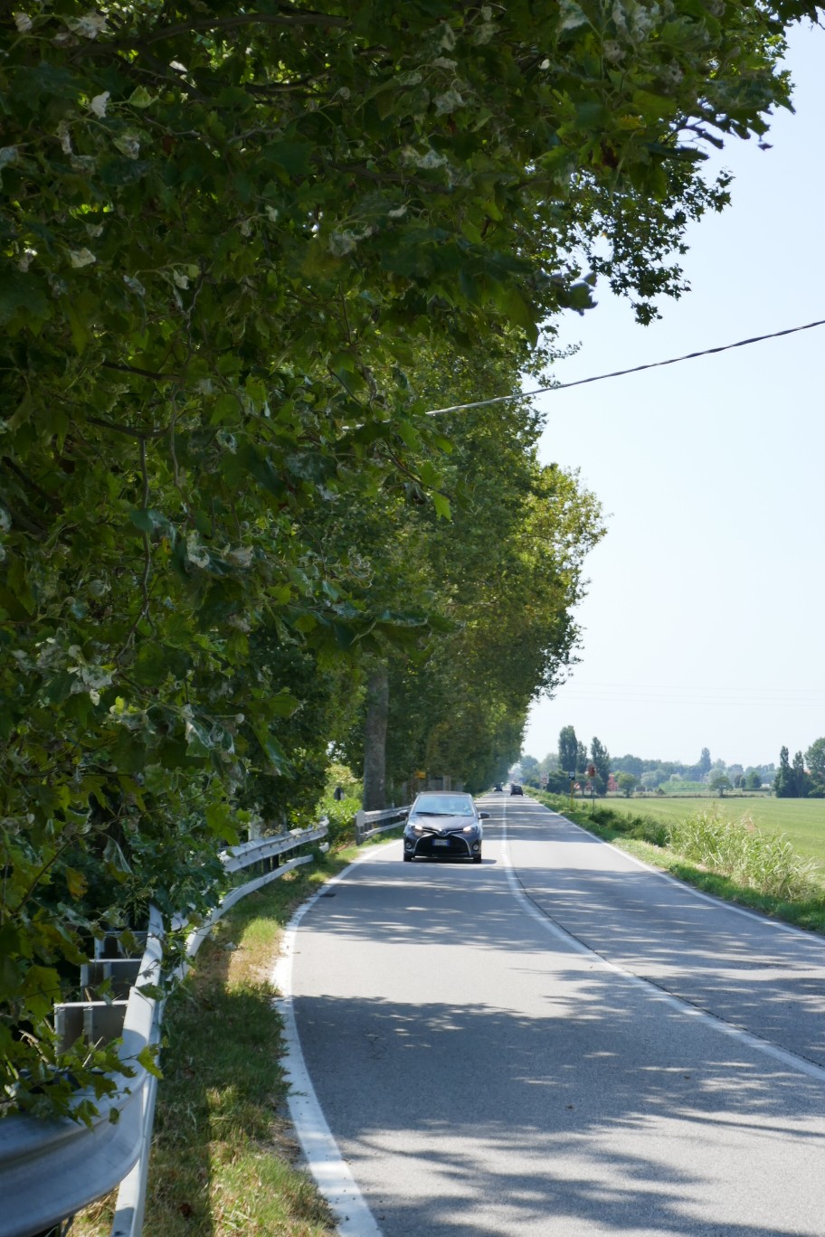 Die heutige Wanderung war sicherlich eine der härtesten des ganzen Weges, 35km bei brütender Hitze, 35 Grad im Schatten hier in Jesolo, wobei es aber auf dem heutigen Weg wenig Schatten hab. Das heißt ich müsste meistens in der prallen Sonne laufen. Da kann dann auch schon mal eine Straße mit moderatem Verkehr, aber mit großen, schattenspendenden Platanen am Straßenrand eine große Wohltat sein.