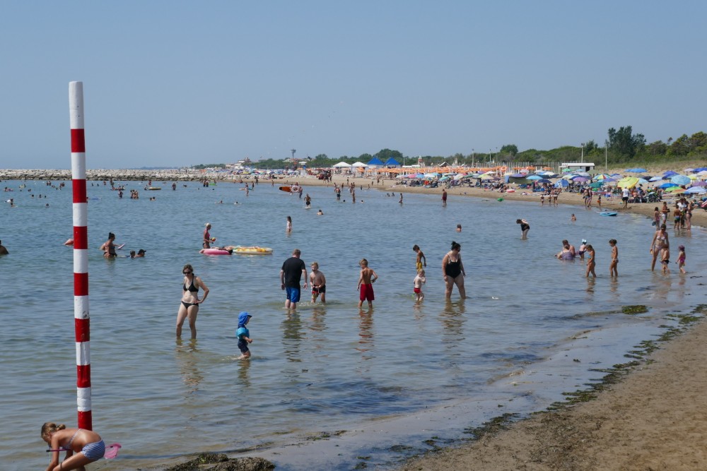 Aber wie alles in der Welt hat auch das mal ein Ende und nach einem etwas unschönen Straßenstück kam das Meer, die Adria. Endlich Mal etwas ganz neues und das angenehmste Erlebnis des heutigen Tages. Nach 30 Tagen in Wanderschuhen über Feld-, Wald- und Wiesenwege, über asphaltierte Straßen, über Felsen, Blockwerk, Geröll und Schneefelder endlich ein Stück barfuß gehen, sich von dem warmen, weichen, feuchten Sand und dem Wasser die Füße massieren zu lassen ist das schönste, was einem auf dieser Wanderung passieren kann.