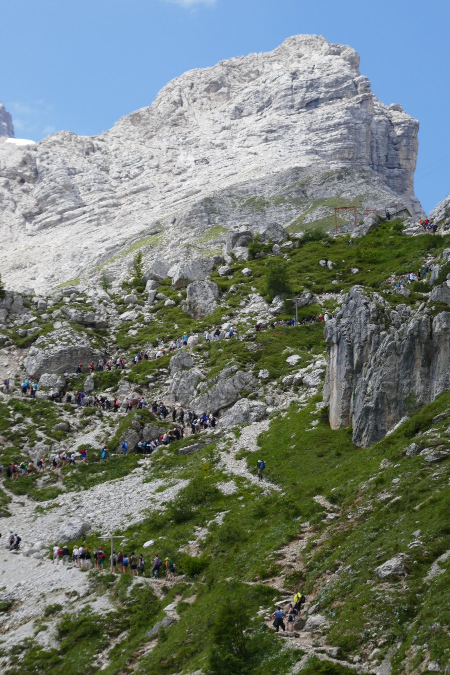 Nach meinem Ruhetag in Alleghe startete ich heute von neuem in die Berge. Aber wer die Einsamkeit der Bergwelt sucht, war auf der heutigen Strecke völlig fehl am Platz. Wie vom Wanderführer vorgeschlagen fuhren wir, d.h. Vicky, Karsten und ich, mit der Bergbahn ersteinmal zum Col dei Baldi, von wo wir dann über den Lago di Coldai zum Rifugio Tissi an der Civetta wandern wollten und es auch getan haben. Aber außer uns hatten noch hunderte andere die gleiche Idee, vor allem viele Jugendgruppen, die lautstark den Berg hinauf stiegen.