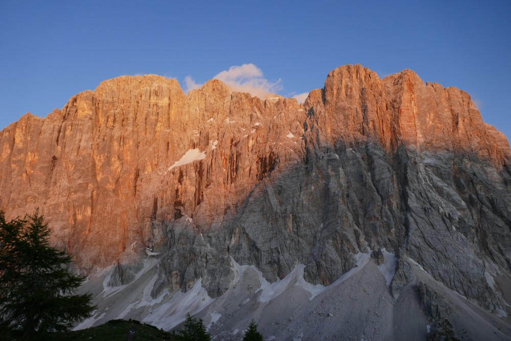 Da wir heute den ganzen Tag ausgezeichnetes Wetter hatten, konnten wir auch einen wunderschönen Sonnenuntergang beobachten, der die Civetta-Wand mit rötlichen Licht anstrahlte. Außerdem war es ein toller Anblick, die Sonne auf der anderen Seite zwischen den Bergen versinken zu sehen.